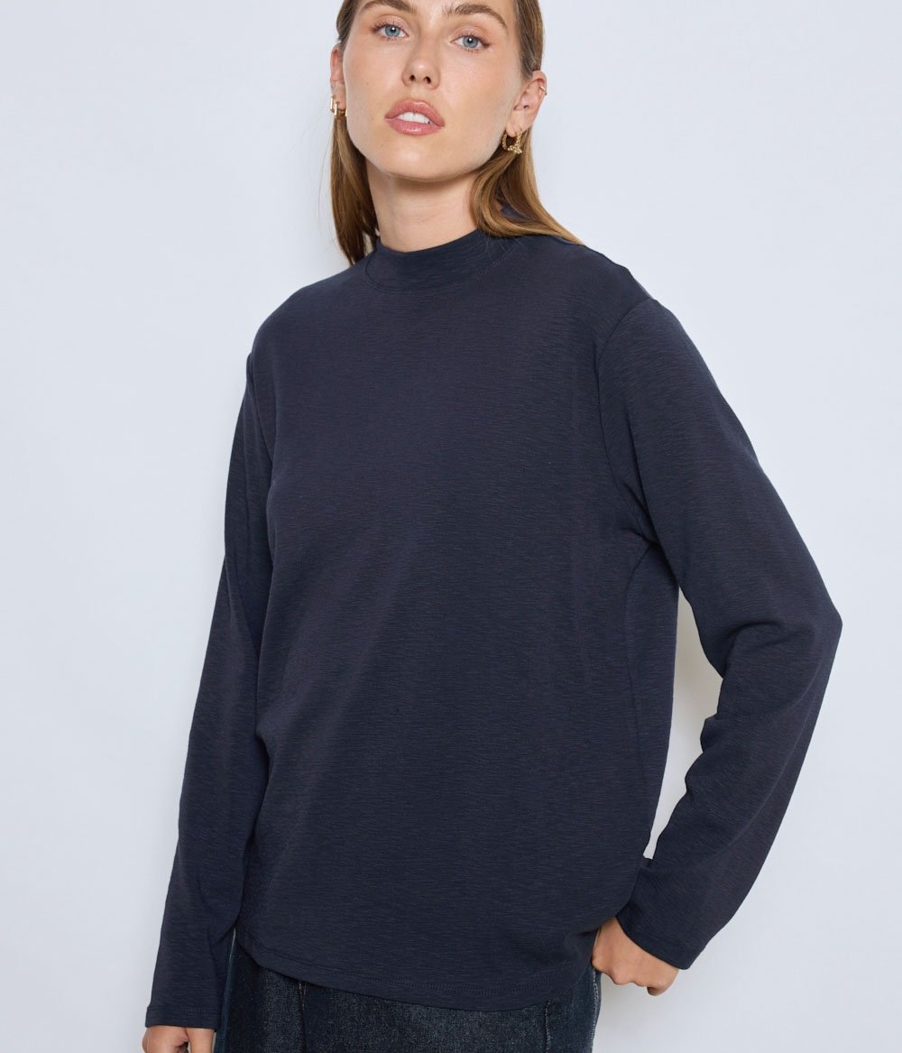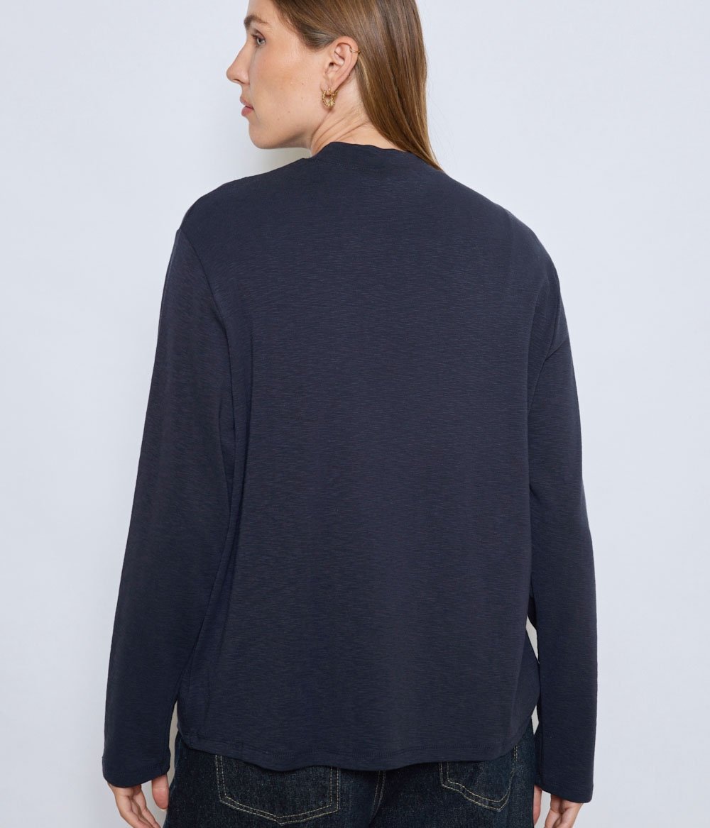 T-shirt navy chiné épais, bord côte large au col, légèrement montant, coupe droite et large