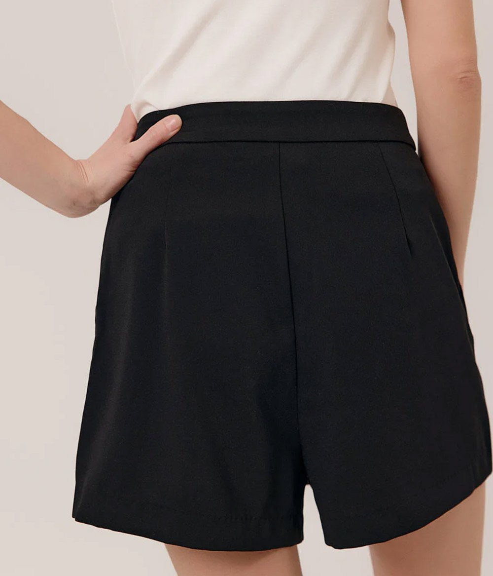 Short effet jupe-culotte à la coupe droite, doté d’un pli plat sur le devant pour une touche élégante. Une pièce polyvalente et moderne, facile à associer pour des looks décontractés ou habillés.